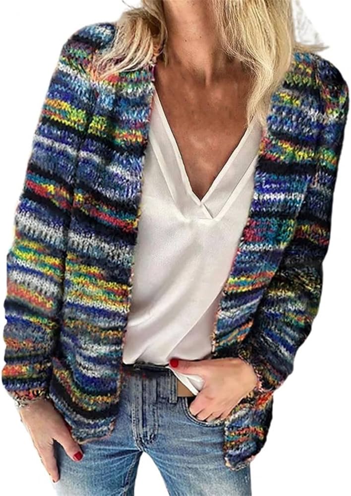 Regenbogen Strickjacke für Damen, Mehrfarbig, Gestreift, Gestrickt, Lässig, Langärmelig, Bunte Pullover, Strickwaren, Oberteile, Vorne Offen, Lockere …