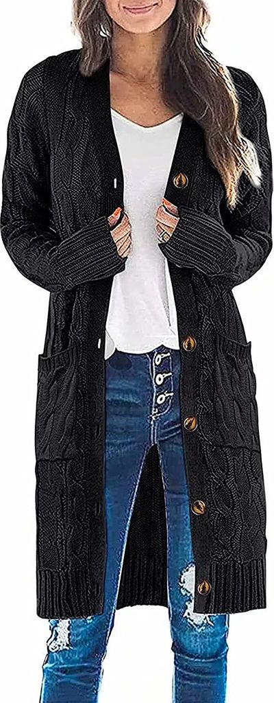 ASKSA Damen Langarm Strickjacke Strick Mantel Zopfstrick Sweater mit Knopfleiste und Taschen, Schwarz, XL