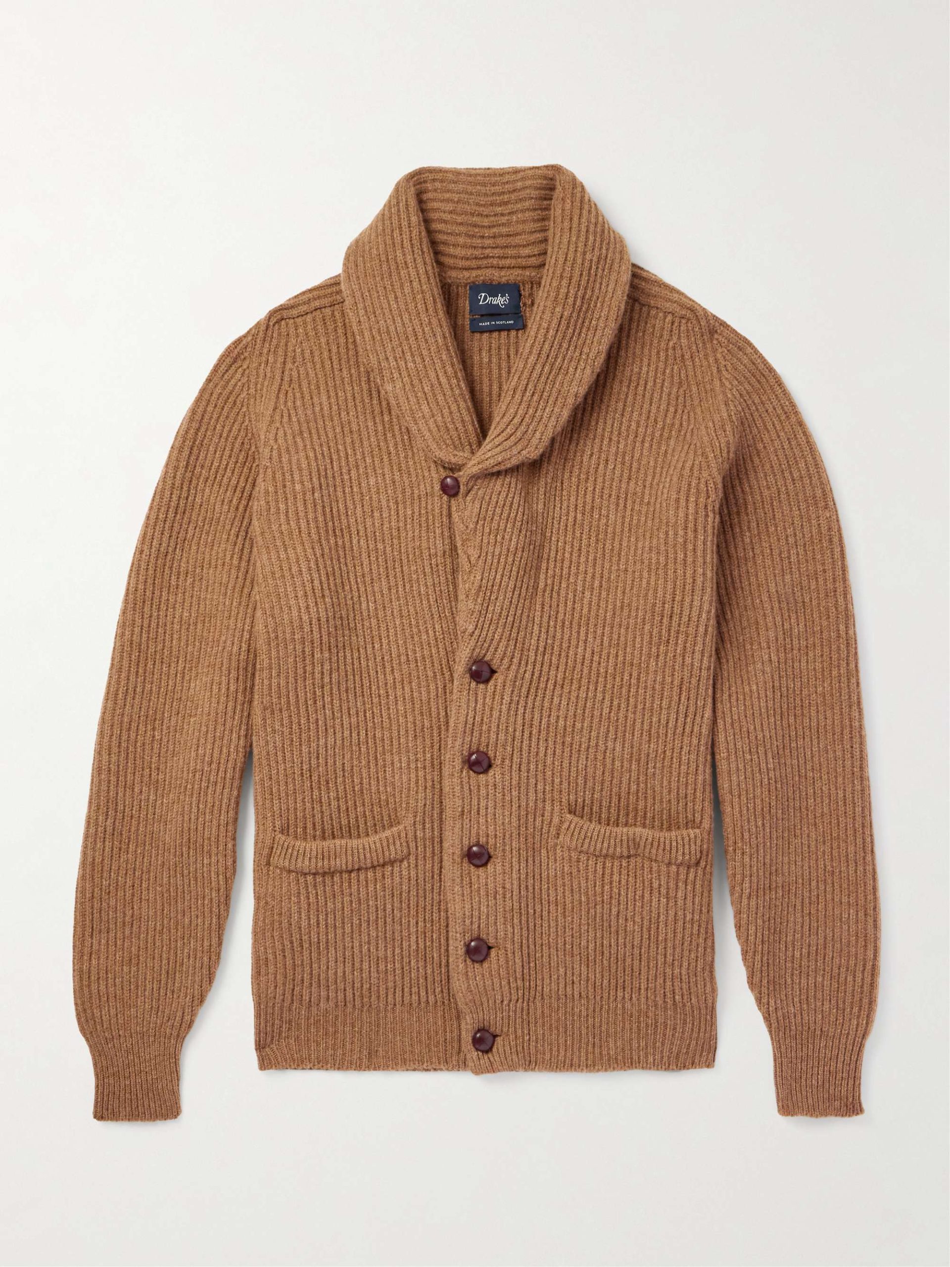 Schmal geschnittener Cardigan aus Wolle in Rippstrick mit Schalkragen braun XXL