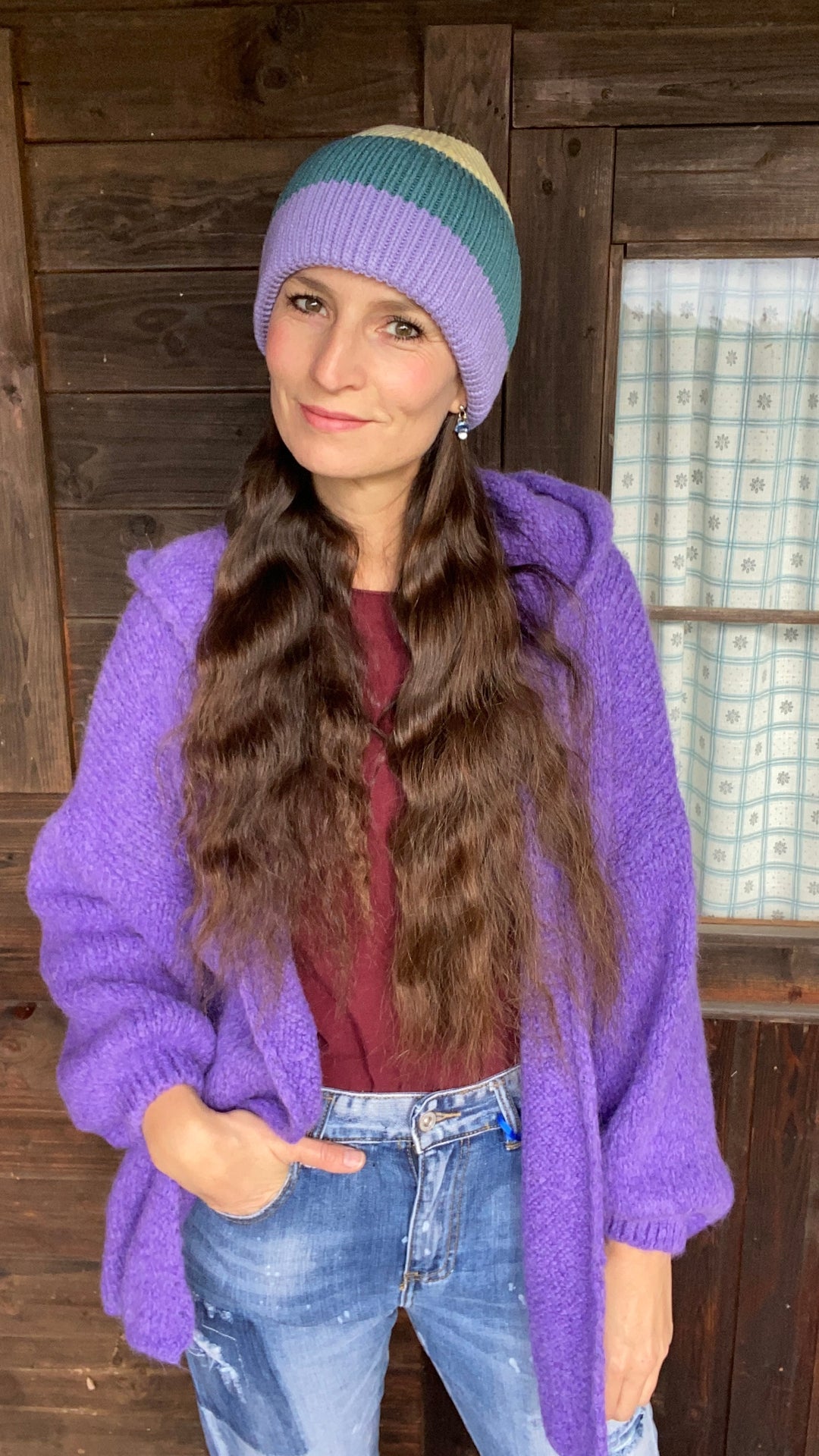 Kapuzenstrickjacke in lila – mein herzblut
