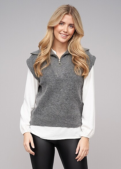 VILA Damen High Neck Strickweste mit Zipper Strukturstoff medium grau