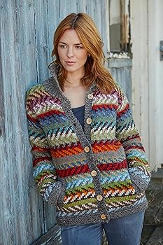 Damen Strickjacke, Wolle, geknöpft, handgestrickt, Chevron Streifen, mehrfarbig, handgefertigt, extra warm, Pachamama Fair Trade, Grau, Mehrfarbig, S …